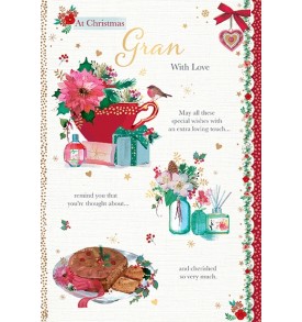 Verse reads: Front - For a special Nan who is dear in every way... Inside - ...this warm and loving wish is sent for a happy Christmas day. So with all the season's greetings this message brings to you, a wish for love and happiness to last the whole year through. For a special Nan With love at Christmas