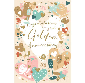 Golden Wedding Anniversary - 50 Years - Golden - Gold Hearts and Flutes