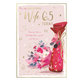 Wife 65th Birthday Card - Bouquet Flowers and Bottle-wrap - Pink
