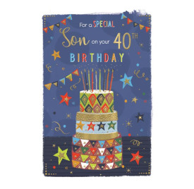 Son 40th Birthday Card - Three Tiered Cake - Banners - Candles