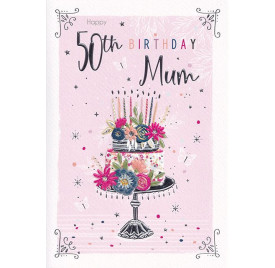 50th Mum Birthday Card - Mom - Two Tier Cake - Silver Cake Stand