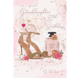 Granddaughter 21st Birthday Card - Perfume - High Heels - Flowers