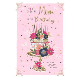 Mom Happy Birthday- Cake on Gold Cake Stand - Flowers