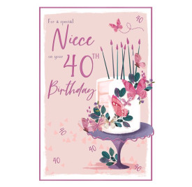Niece 40th Birthday Card - Cake with purple cake stand - pink butterflies