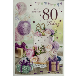 Open Female 80 Today - Birthday Card - Two Tier Cake - Purple Flowers