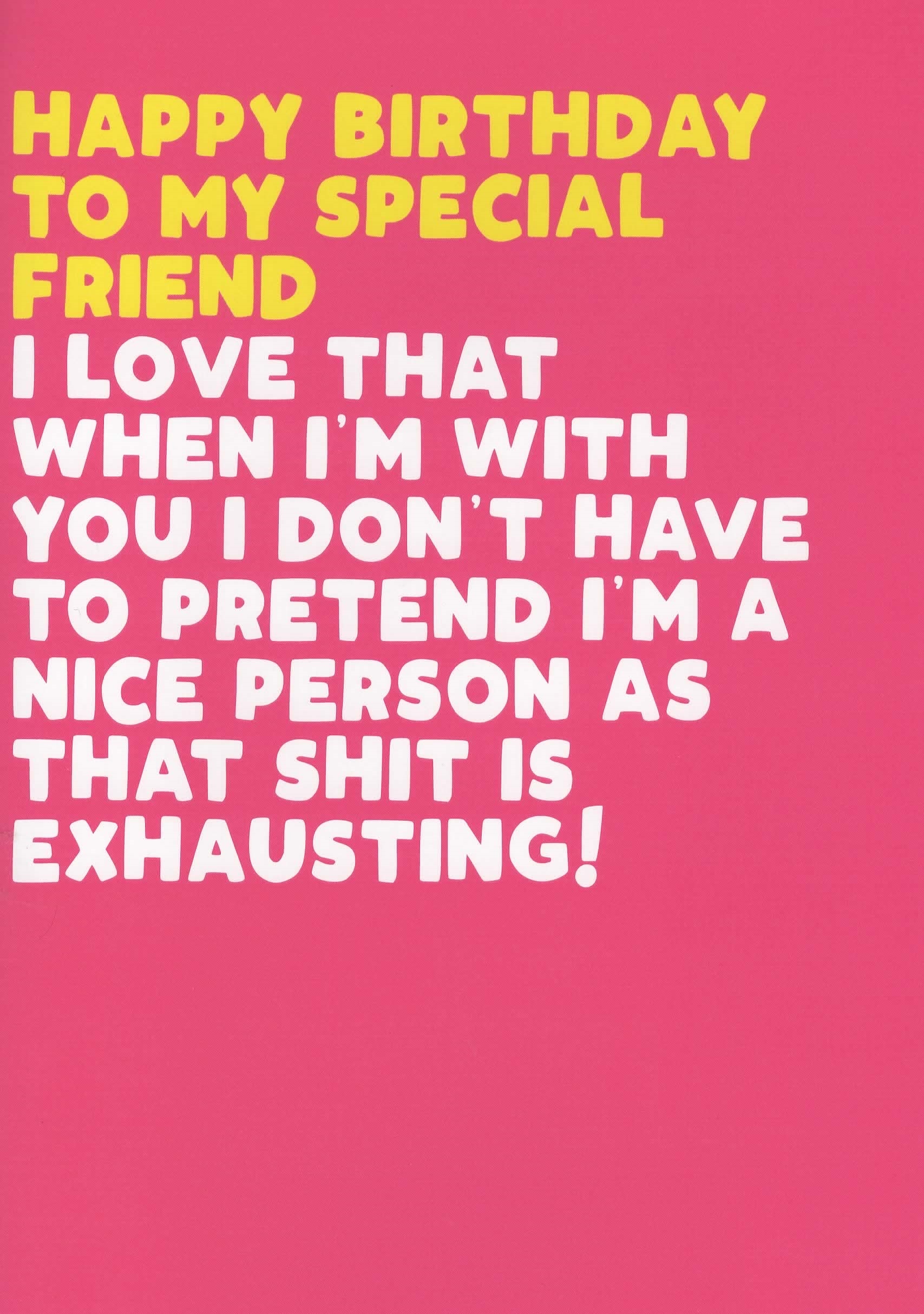 Verse reads: Front - Happy Birthday to my special friend I love that when I'm with you I don't have to pretend I'm a nice person as that sh*t is exhausting!