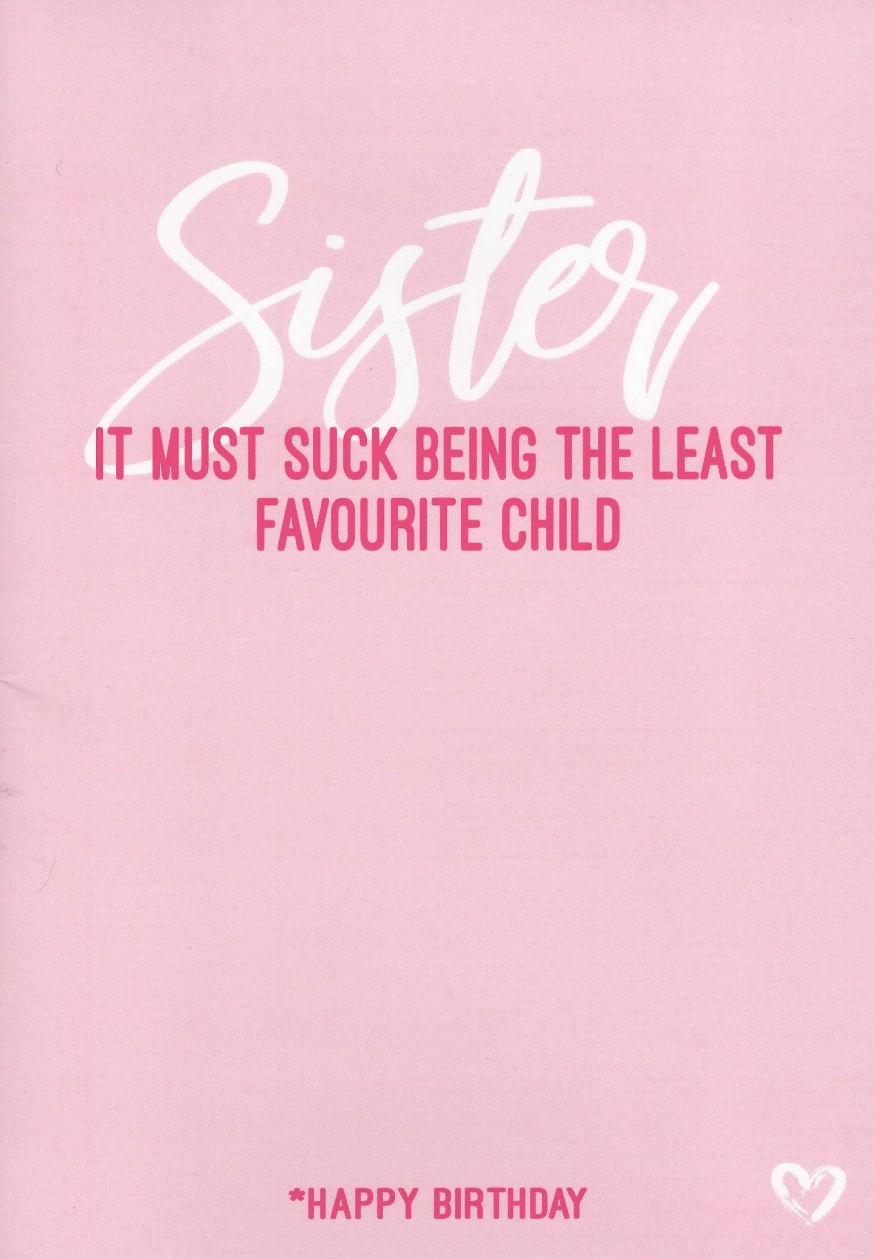 Verse reads: Front - Sister It must suck being the least favourite child *Happy Birthday