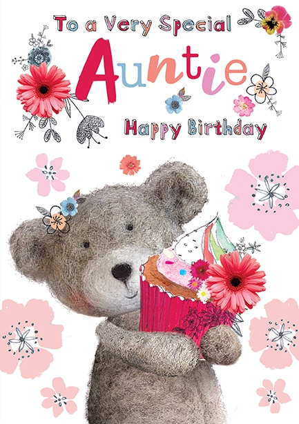 Verse reads: You're an amazing Auntie and now your birthday's here, Hope all the happiness that it brings lasts throughout the year. On your birthday Auntie with love