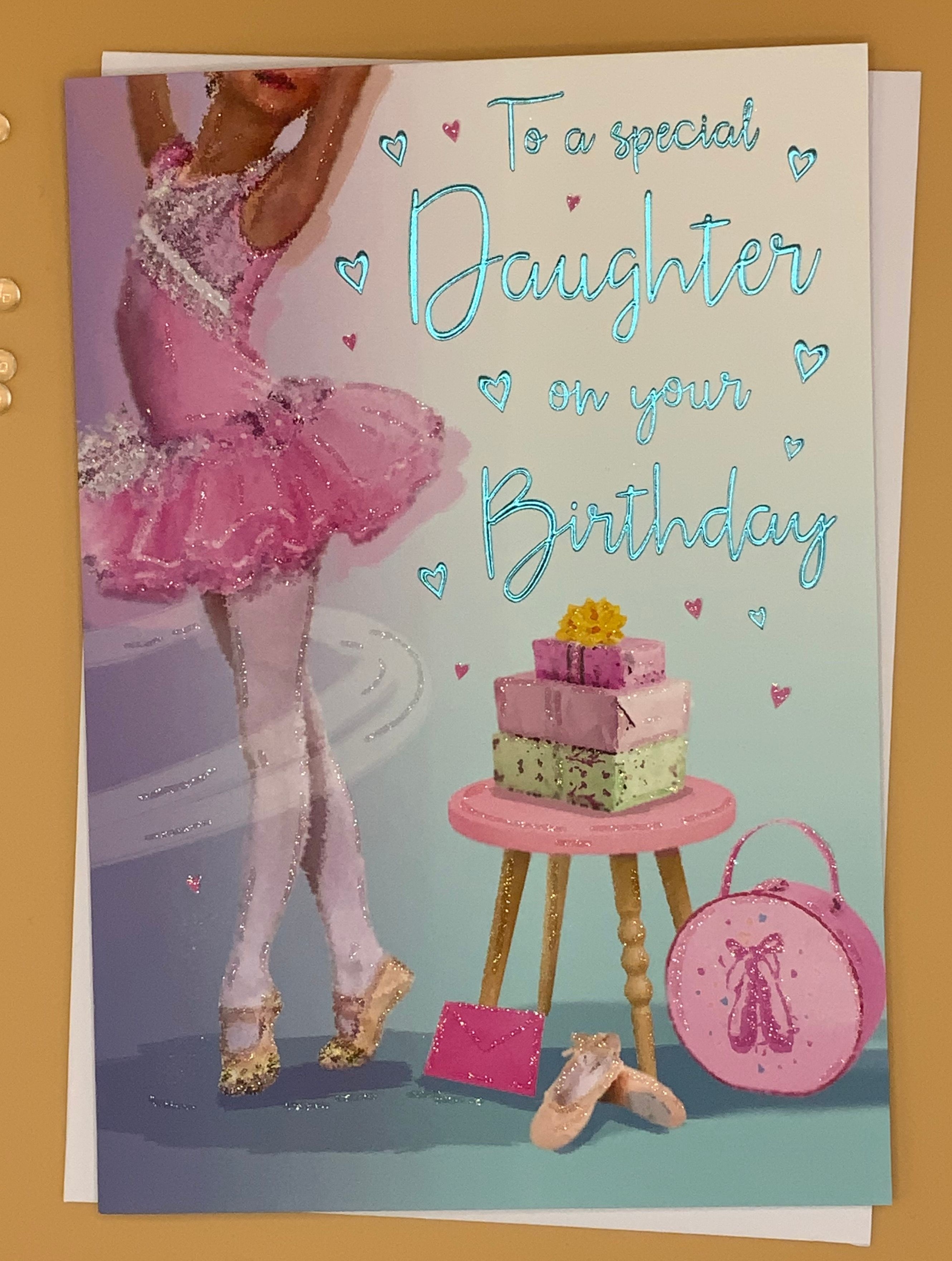 Verse reads: Daughter, it's your birthday You're a very precious girl Because you're kind and thoughtful bringing joy into the world Here's a wish for happiness and dreams that will come true You're loved so very dearly today and your whole life through
