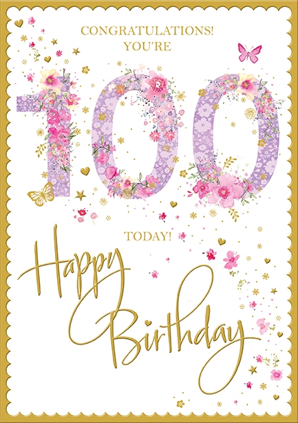 Verse reads: Today's a very special date for you to reflect with pleasure, on 100 years of memories and a milestone you can treasure. Congratulations on your 100th Birthday