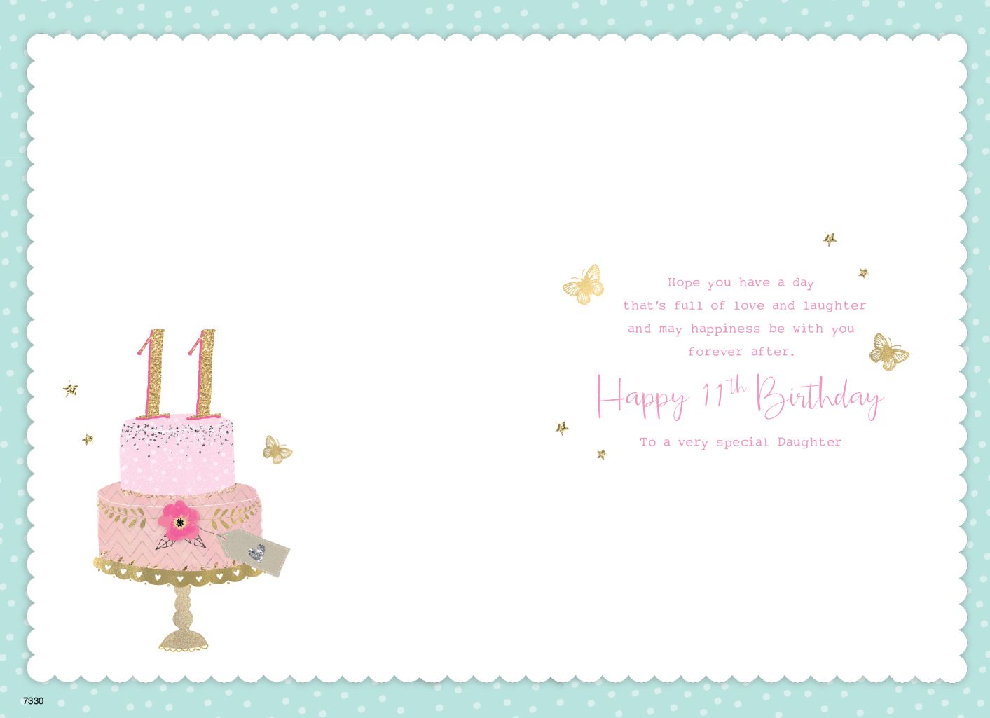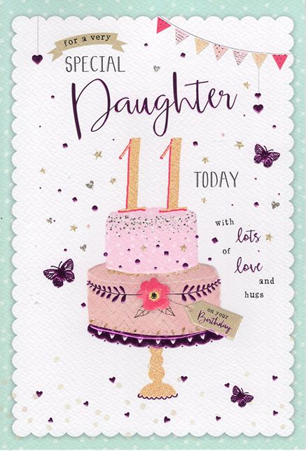 Verse reads: Front- with lots of love and hugs. Inside- Hope you have a day that's full of love and laughter and may happiness be with you forever after. Happy 11th Birthday To a very special Daughter