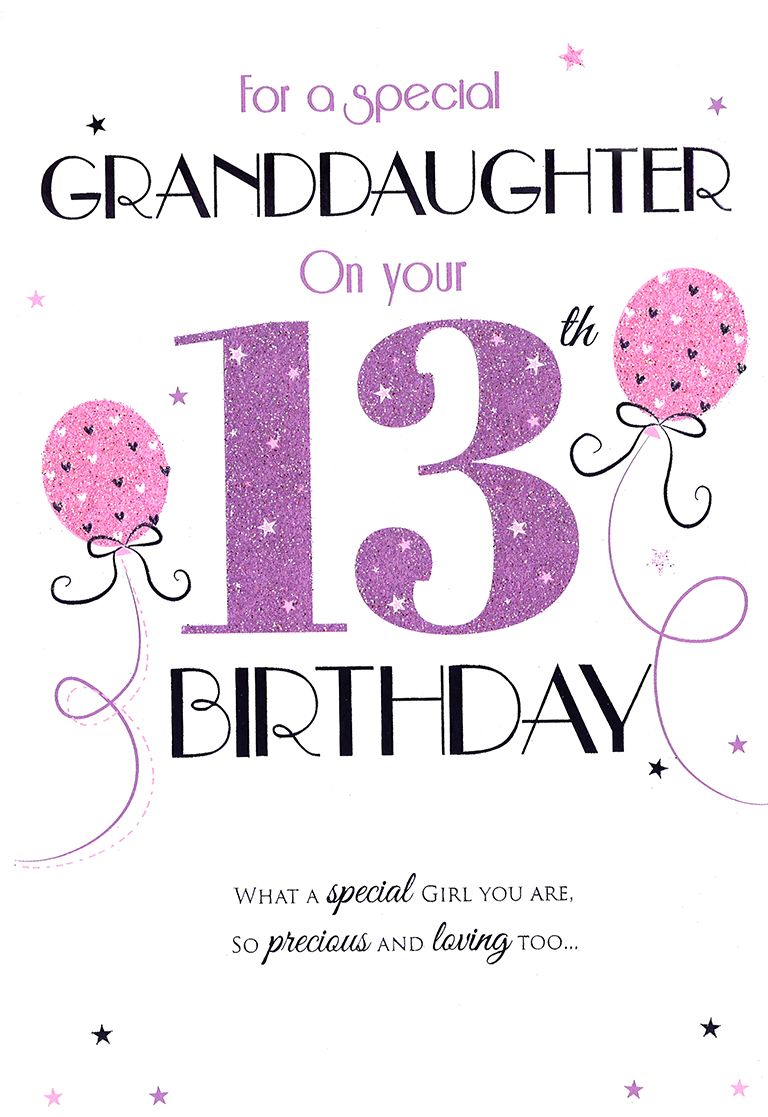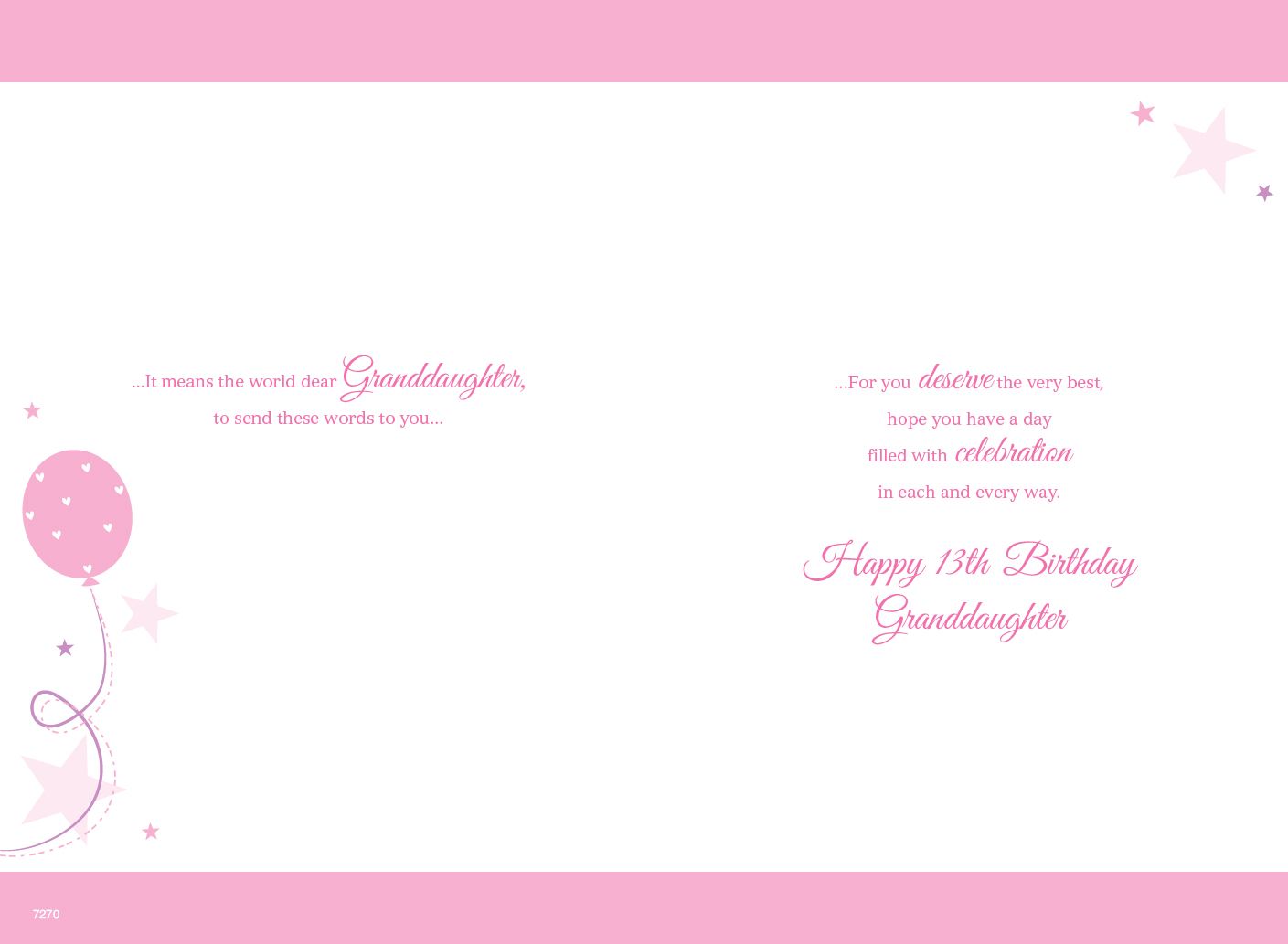 Verse reads: Front- What a special girl you are, so precious and loving too...It means the world dear Granddaughter, to send these words to you... For you deserve the very best, hope you have a day filled with celebration in each and every way. Happy 13th Birthday Granddaughter