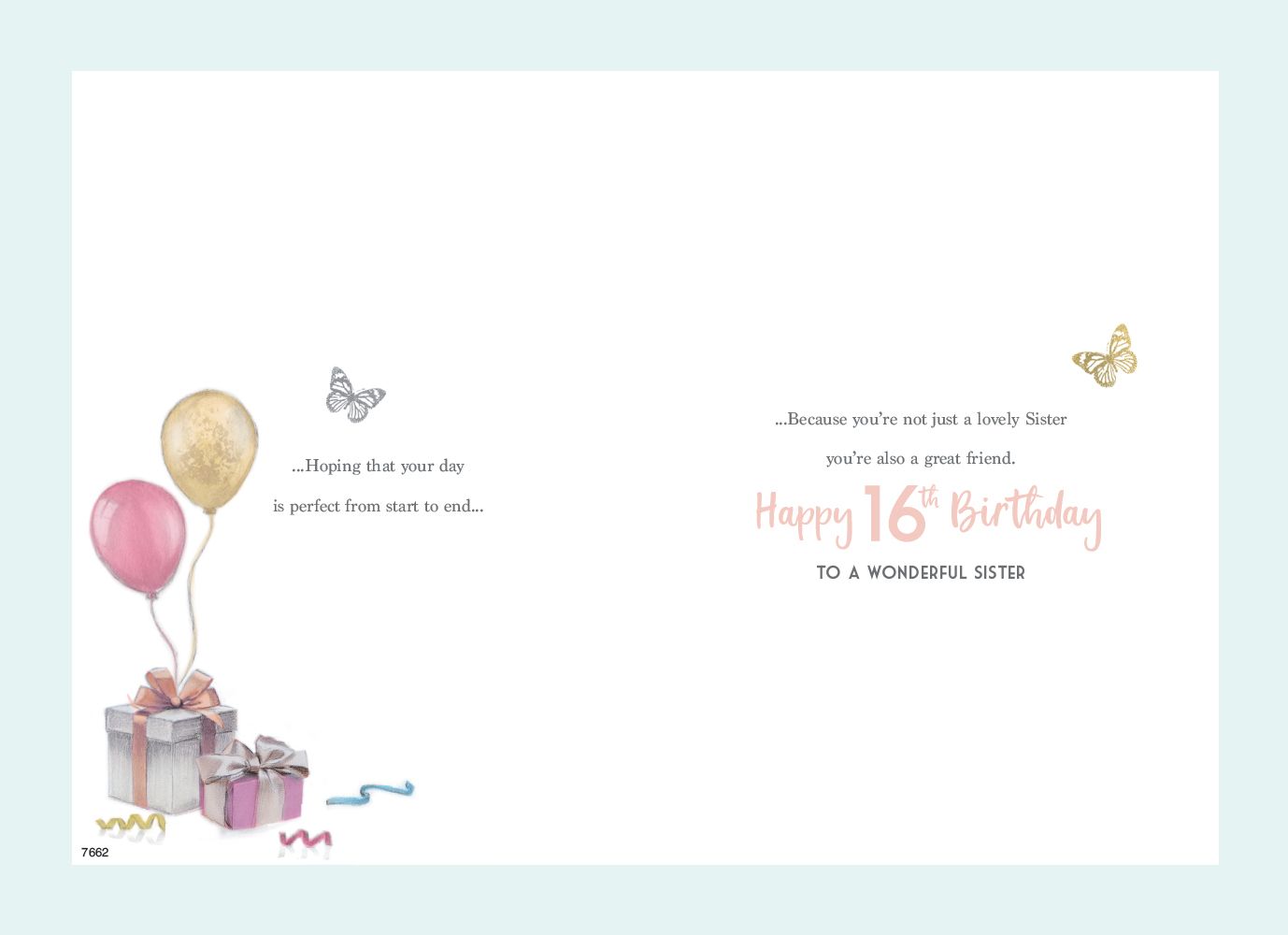 Verse reads: Front - You're such a special Sister there's no-one quite like you, so wishing you a happy birthday where all your dreams come true... Inside... Hoping that your day is perfect from start to end... ...Because you're not just a lovely Sister you're also a great friend. Happy 16th Birthday to a wonderful Sister