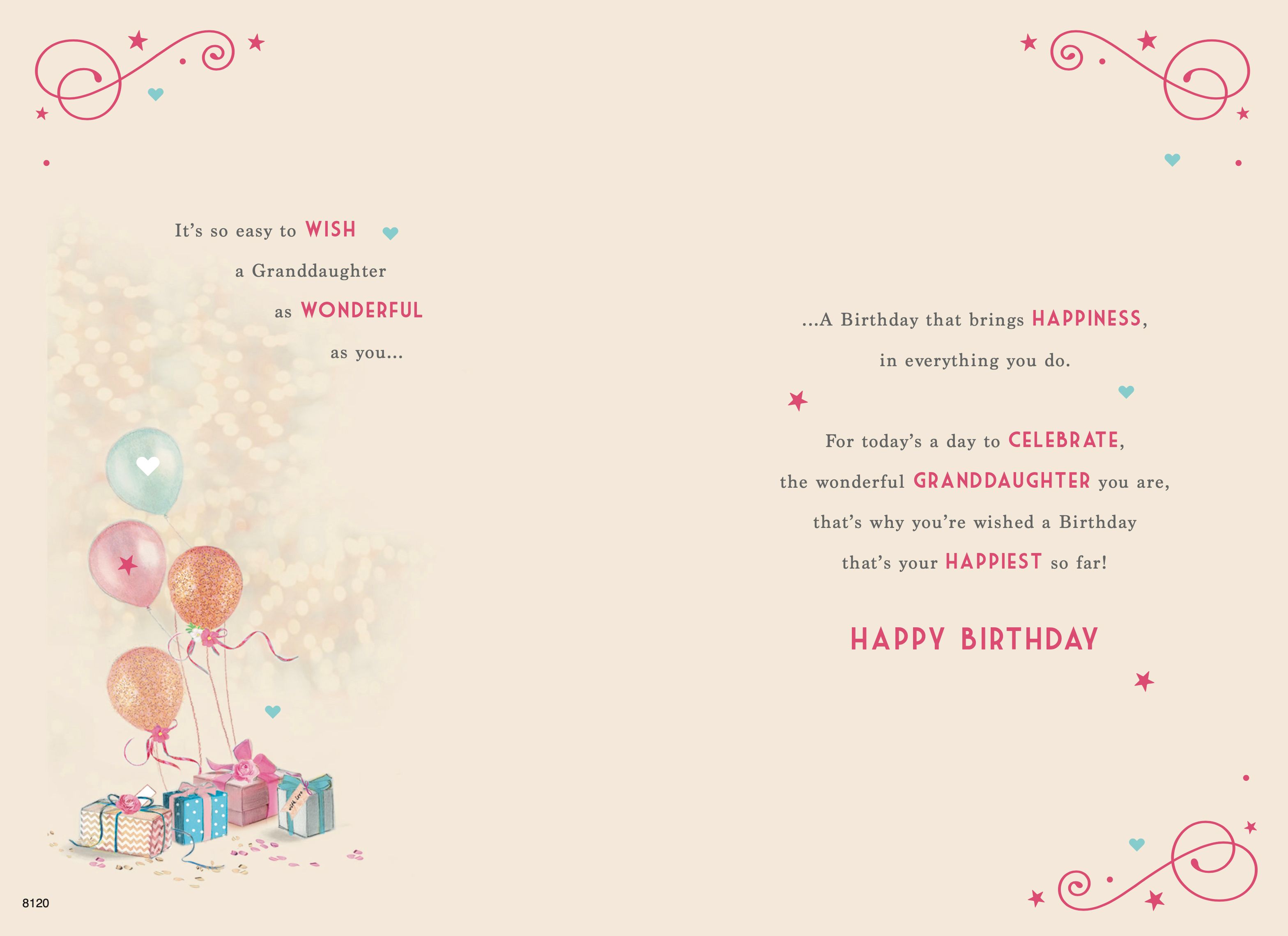 Verse reads: It's so easy to wish a Granddaughter as wonderful as you... ...A birthday that brings happiness, in everything you do. For today's a day to celebrate, the wonderful Granddaughter you are, that's why you're wished a birthday that's your happiest so far! Happy Birthday