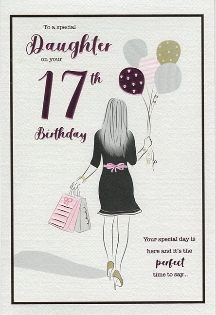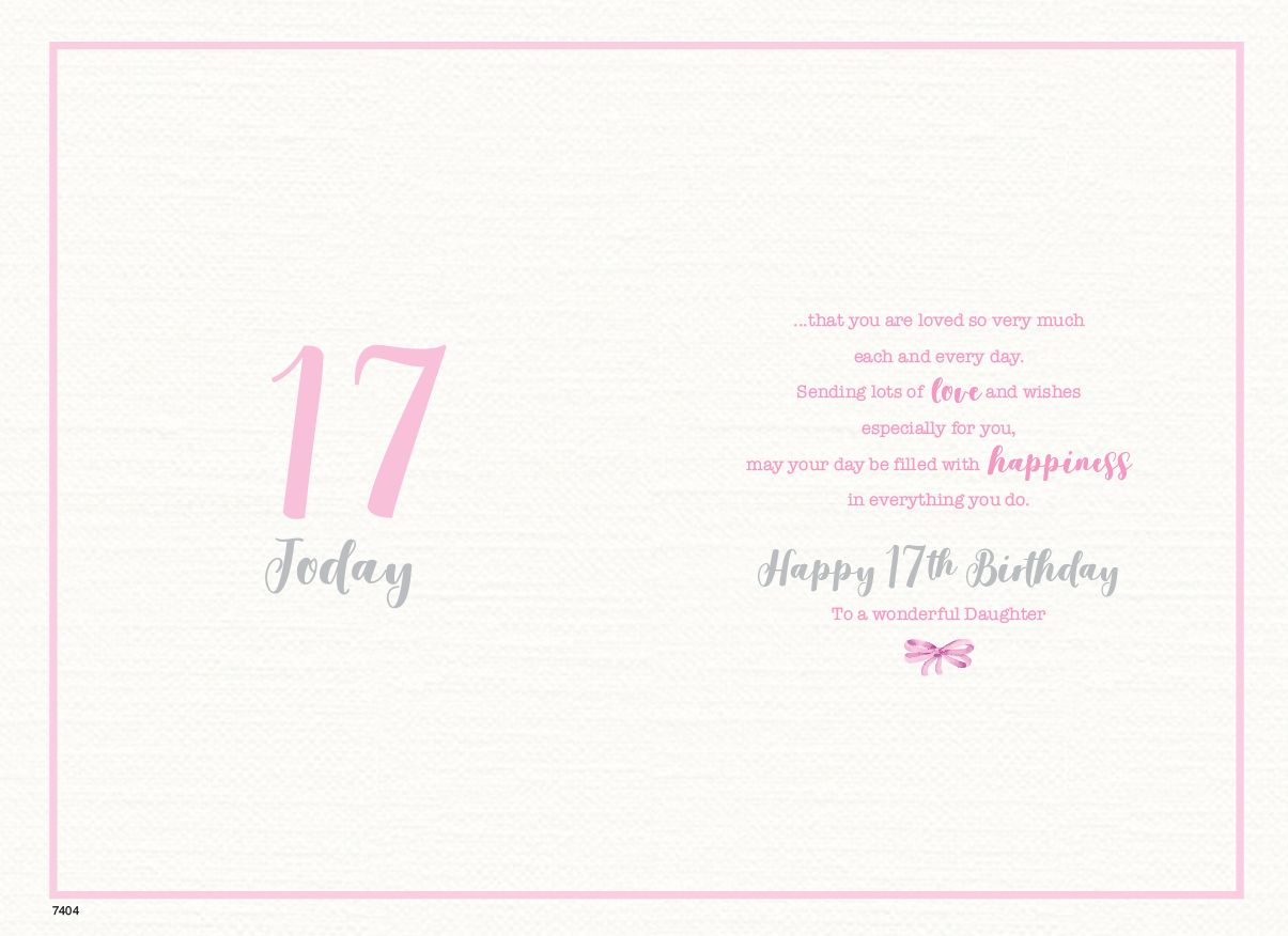 Verse reads: Front- Your special day is here and it's the perfect time to say...that you are loved so very much each and every day. Sending lots of love and wishes especially for you, may your day be filled with happiness in everything you do. Happy 17th Birthday to a wonderful Daughter