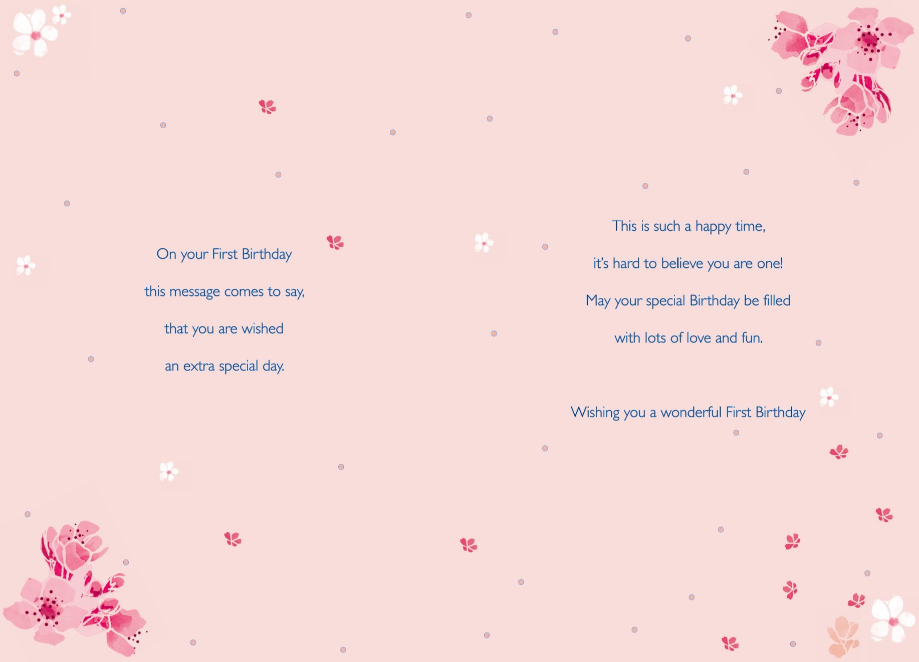 Verse: On your First Birthday this message comes to say, that you are wished an extra special day. This is such a happy time, it's hard to believe you are one! May your special Birthday be filled woth lots of love and fun. Wishing you a wonderful First Birthday,