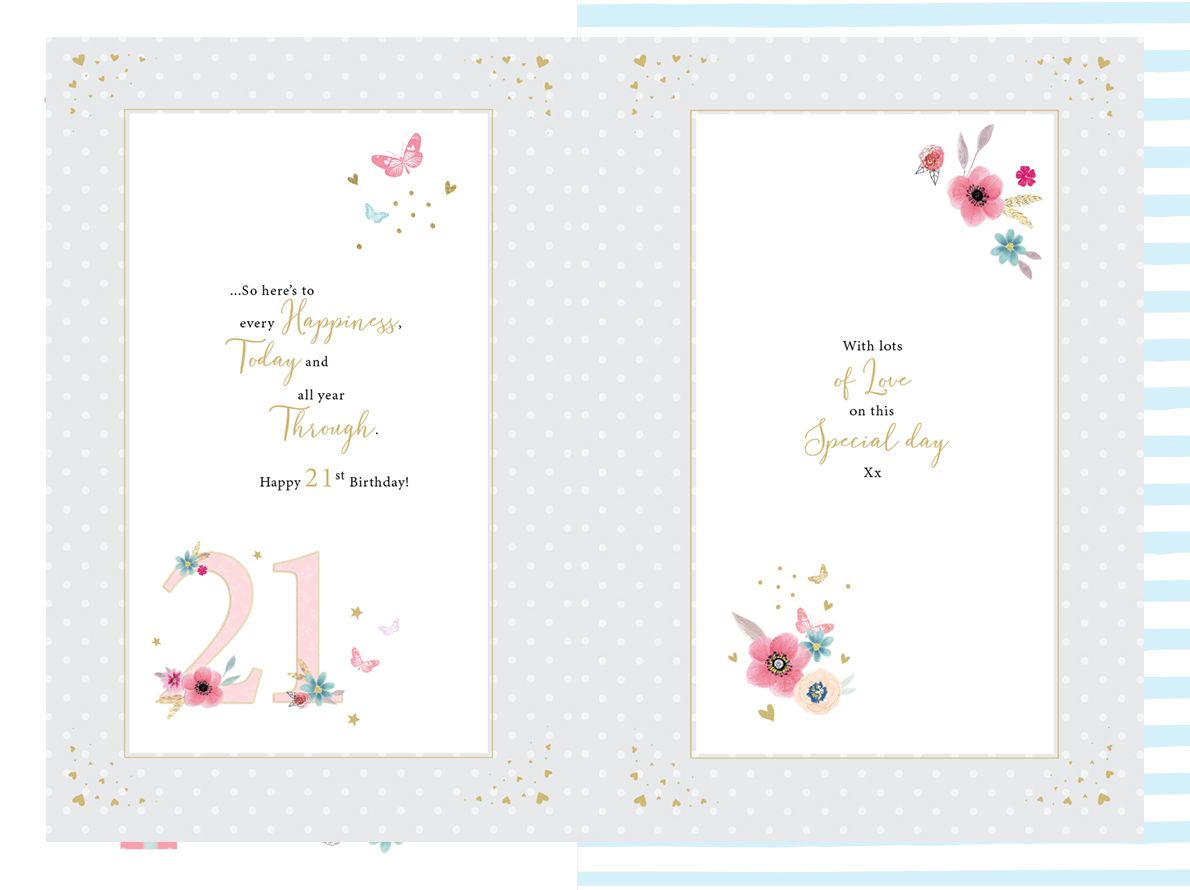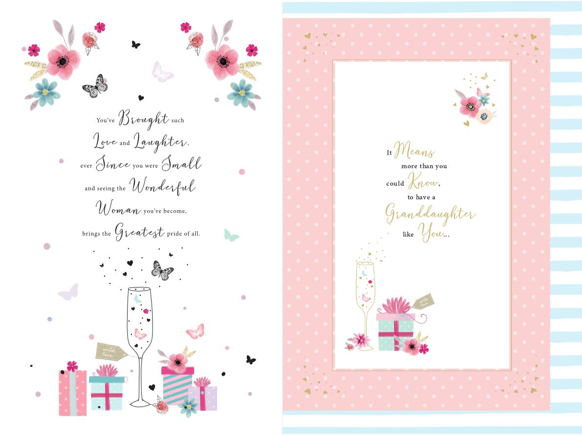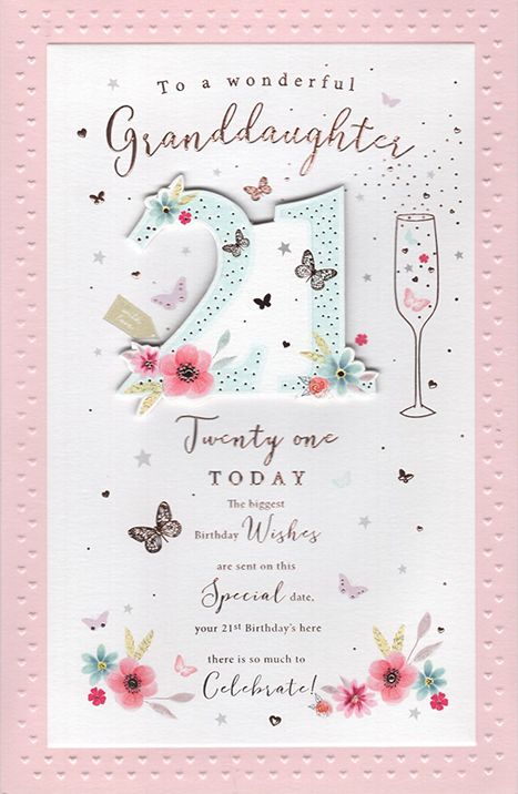 Verse reads: Front - Twenty one today The biggest birthday wishes are sent on this special date, your 21st birthday's here there is so much to celebrate! Inside - You've brought such love and laughter, ever since you were small and seeing the wonderful woman you've become, brings the greatest pride of all. It means more than you could know, to have a Granddaughter like you... ...So here's to every happiness, today and all year through. Happy 21st Birthday! With lots of love on this special day xx