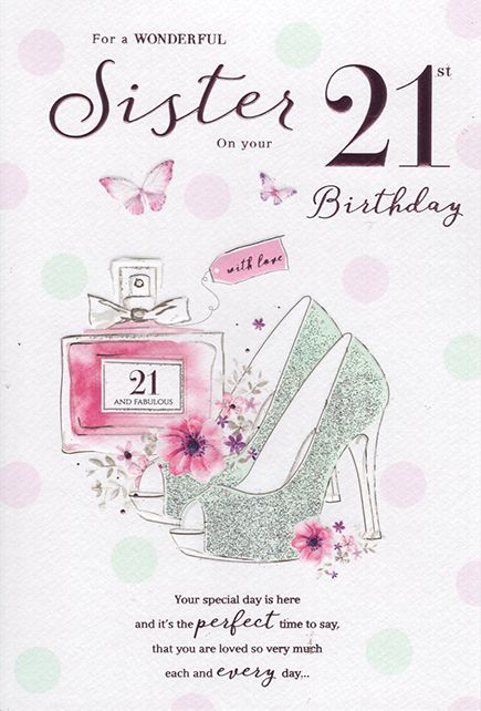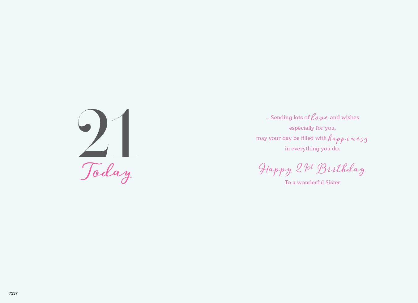 Verse reads: Front - Your special day is here and it's the perfect time to say, that you are loved so very much each and every day... Inside - ...Sending lots of love and wishes especially for you, may your day be filled with happiness in everything you do. Happy 21st Birthday to a wonderful Sister