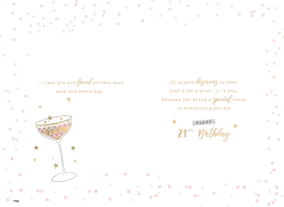 Verse reads: Front - Your special day is here and it's the perfect time to say... Inside - ... that you are loved so very much each and every day. If anyone deserves to feel just like a star - it's you, because you bring a special touch to everything you do! Happy 21st Birthday