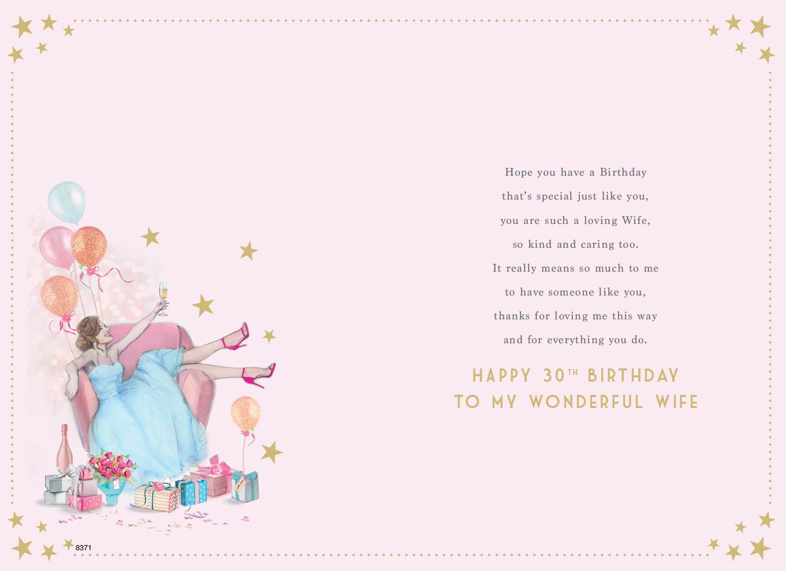 Verse reads: Hope you have a birthday that's special just like you, you are such a loving Wife, so kind and caring too. It really means so much to me to have someone like you, thanks for loving me this way and for everything you do. Happy 30th Birthday to my wonderful Wife