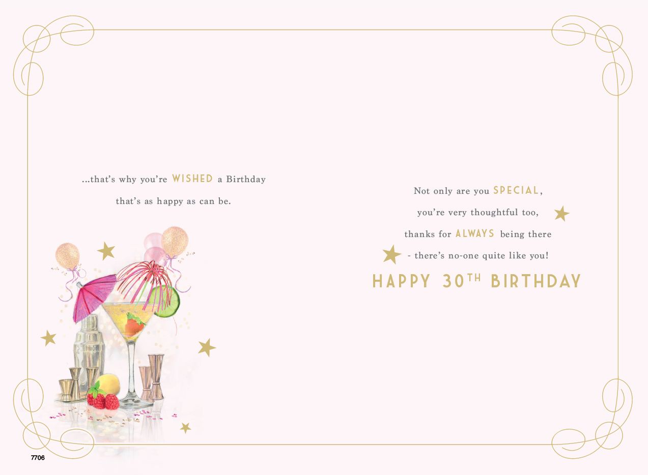 Verse: Front..You play such a special part within the family... Inside... that's why you're wished a Birthday that's as happy as can be. Not only are you special, you're very thoughtful too, thanks for always being there - there's no-one quite like you! Happy 30th Birthday