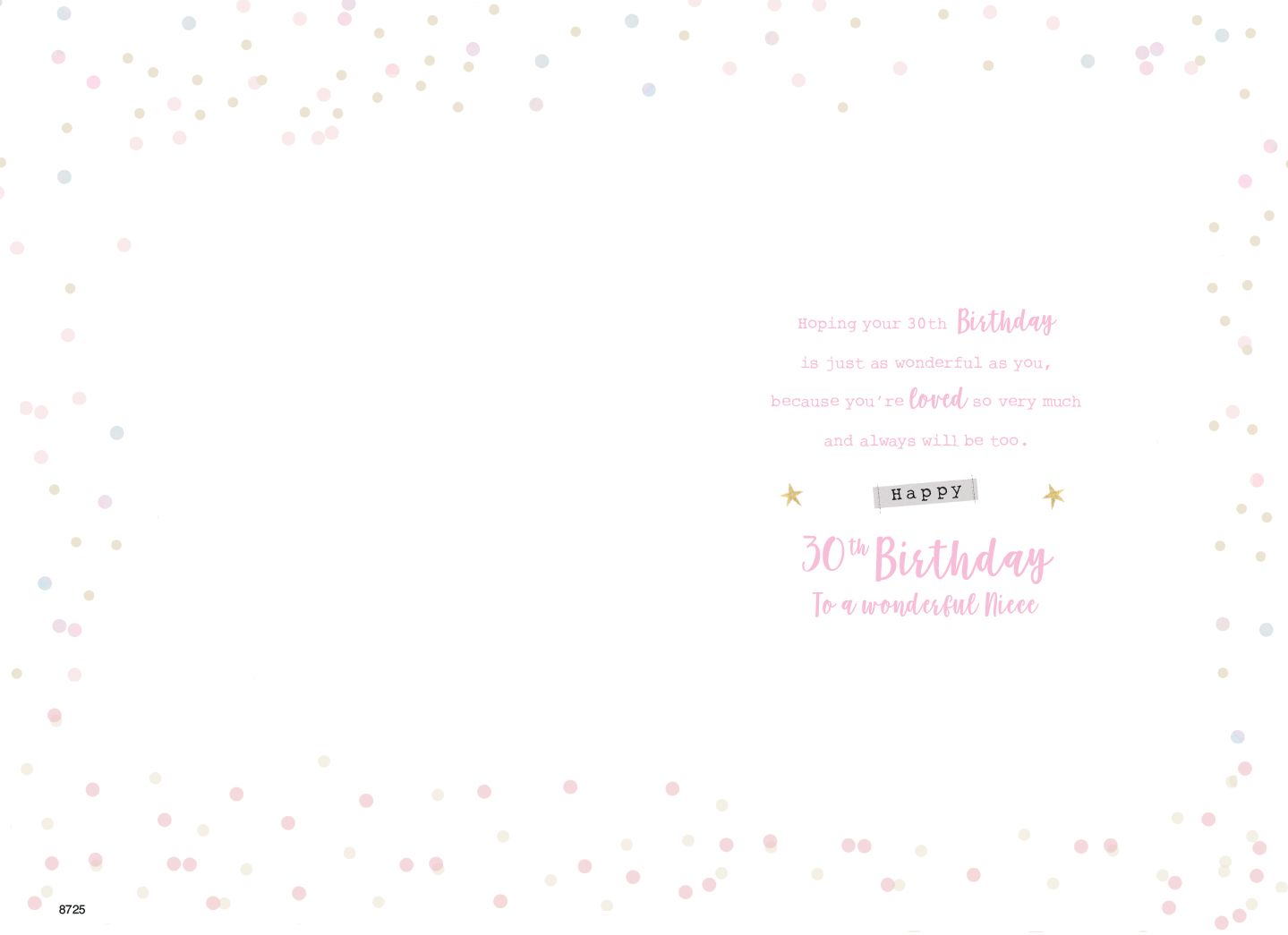 Verse reads: Hoping your 30th Birthday is just as wonderful as you, because you'e loved so very much and always will be too. Happy 30th Birthday to a wonderful Niece