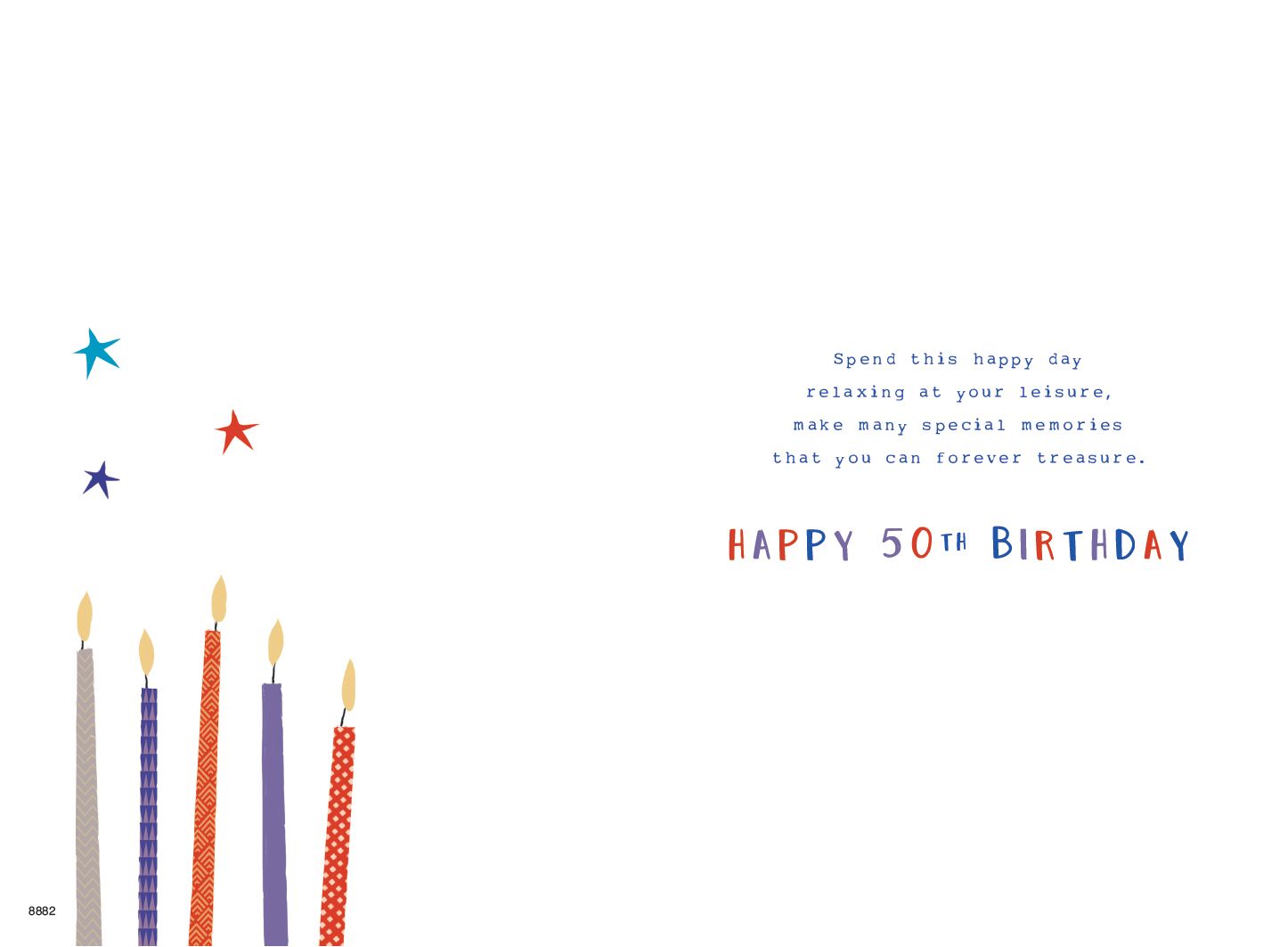 Verse reads: Spend this happy day relaxing at your leisure, make many special memories that you can forever treasure. Happy 50th Birthday