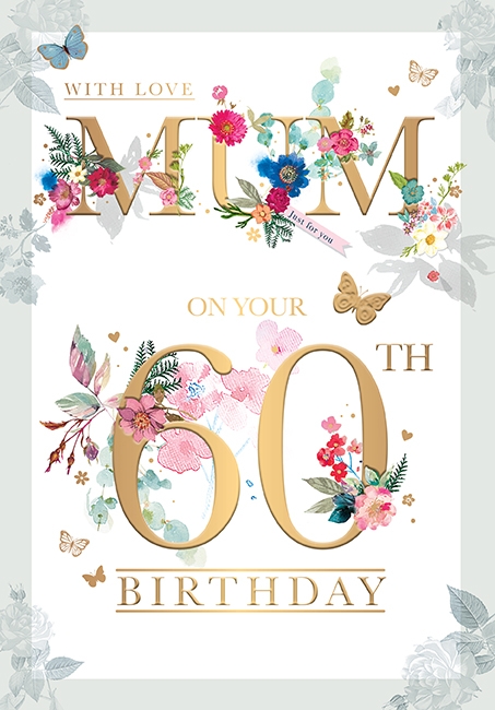 Verse reads: This happy birthday greeting is sent with love and cheer, As you begin to celebrate your special 60th year. With Love on your 60th Birthday MUM