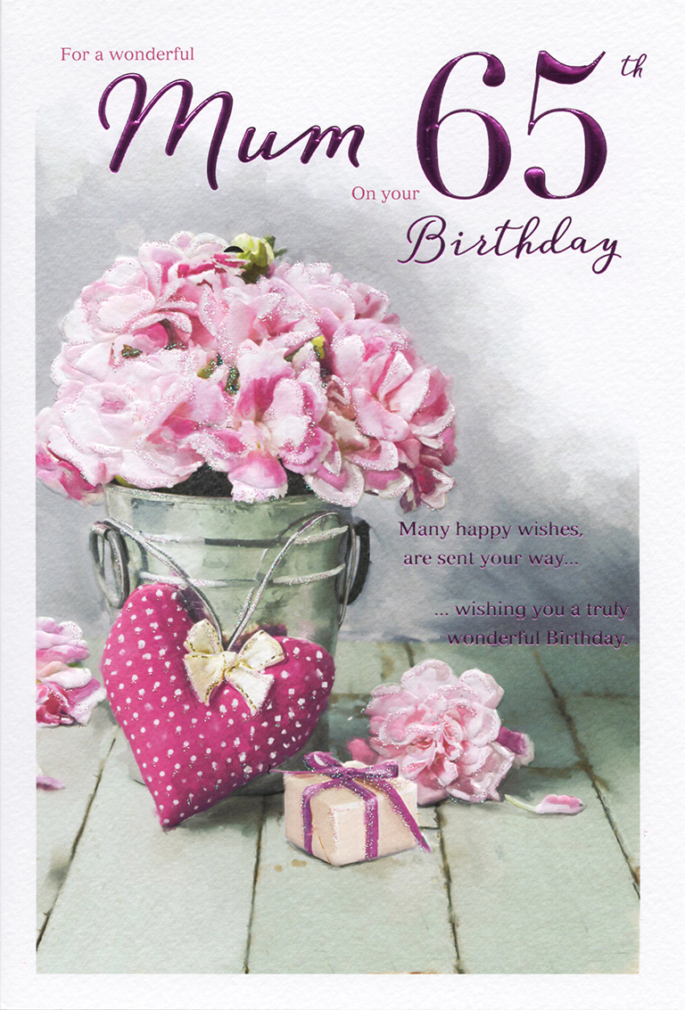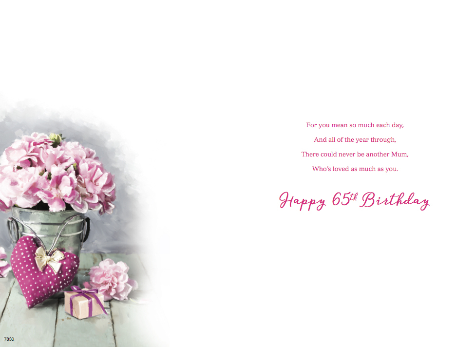 Verse reads: Front - Many happy wishes are sent your way... ...wishing you a truly wonderful Birthday. Inside - For you mean so much each day, And all of the year through, There could never be another Mum, Who's loved as much as you. Happy 65th Birthday