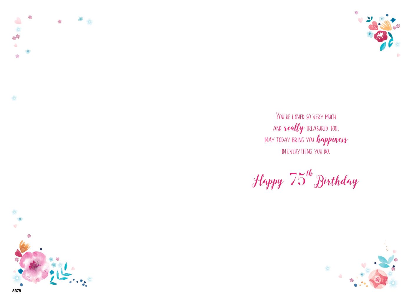 Verse reads: Front - You're such a wonderful Mum in every single way, now your special day is here these words are just to say... Inside - You're loved so very much and really treasured too, may today bring you happiness in everything you do. Happy 75th Birthday