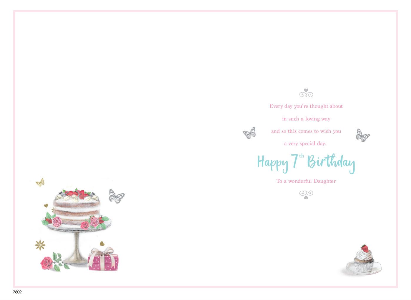 Verse reads: Front- Sending lots of Birthday wishes is such a lovely thing to do, for a Daughter who's amazing and as wonderful and unique as you! Inside- Every day you're thought about in such a loving way and so this comes to wish you a very special day. Happy 7th Birthday to a wonderful Daughter