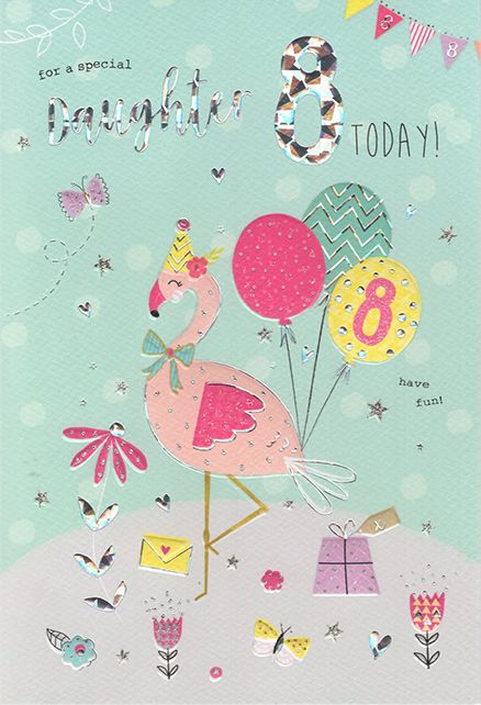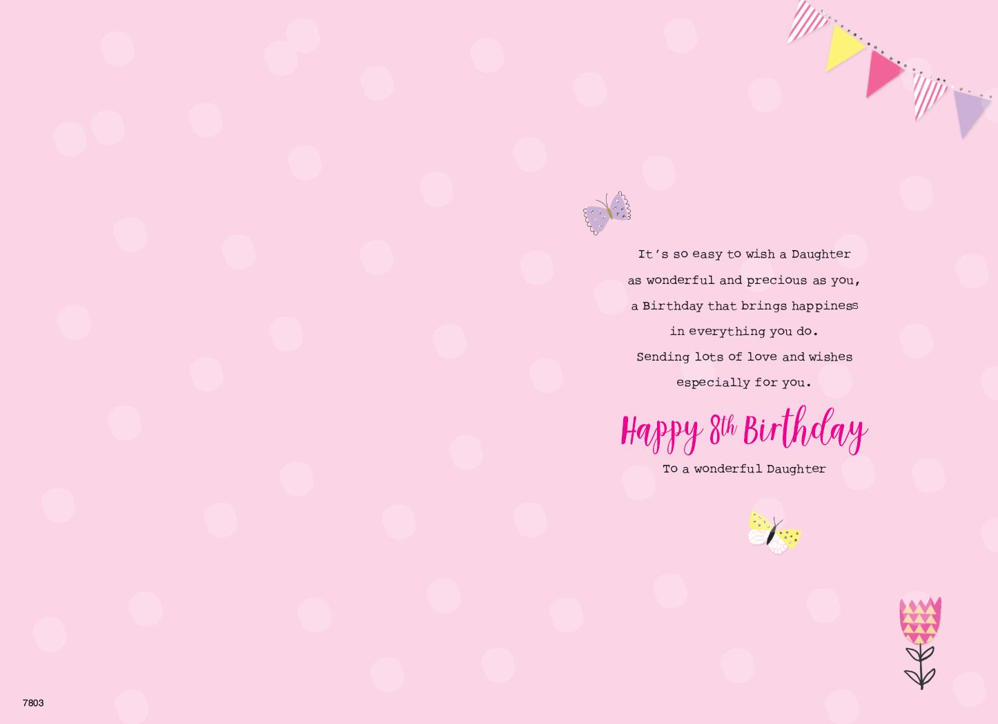 Verse reads: It's so easy to wish a Daughter as wonderful and precious as you, a Birthday that brings happiness in everything you do. Sending lots of love and wishes especially for you. Hapy 8th birthday to a wonderful Daughter.