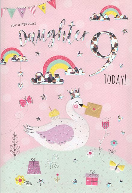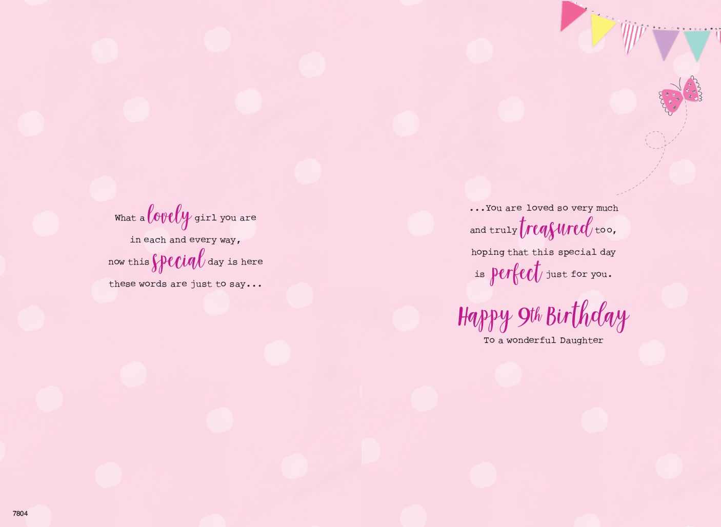 Verse reads: What a lovely girl you are in each and every way, now this special day is here theses words are just to say... ... You are loved so very much and truly treasured too, hoping that this special day is perfect just for you. Happy 9th Birthday to a wonderful Daughter