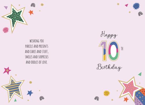 Verse: wishing you parcels and presents and cakes and stuff, smiles and surprises and oodles of love happy 10th birthday