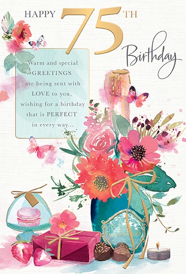 Verse reads: Front: Warm and special GREETINGS are being sent with love to you, wishing for a birthday that is perfect in every way....