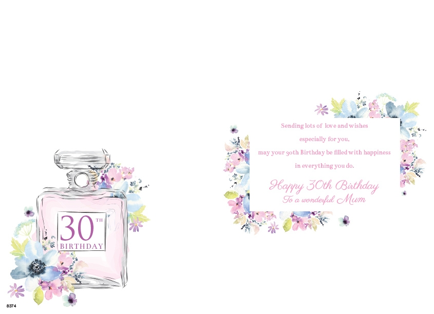 Verse reads: Sending lots of love and wishes especially for you, may your 30th Birthday be filled with happiness in everything you do. Happy 30th Birthday to a wonderful Mum