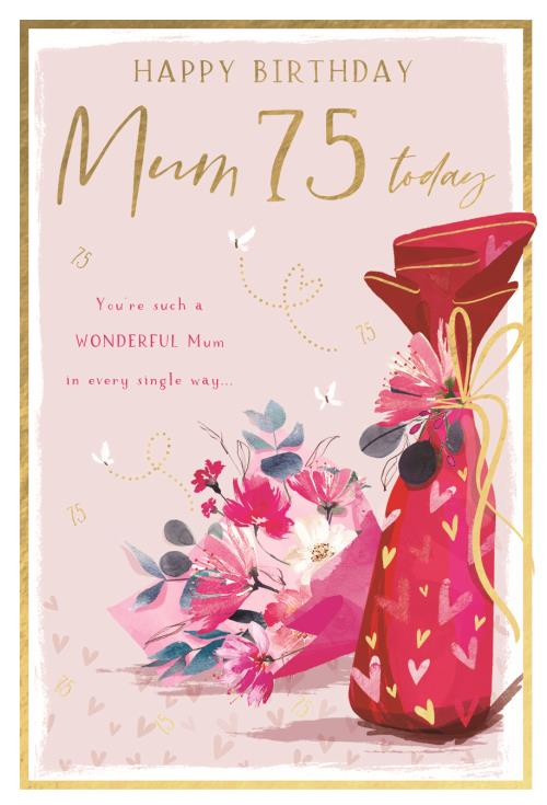 Mum 75th Birthday - Bottle Wrap - Pink Bouquet Flowers - Verse