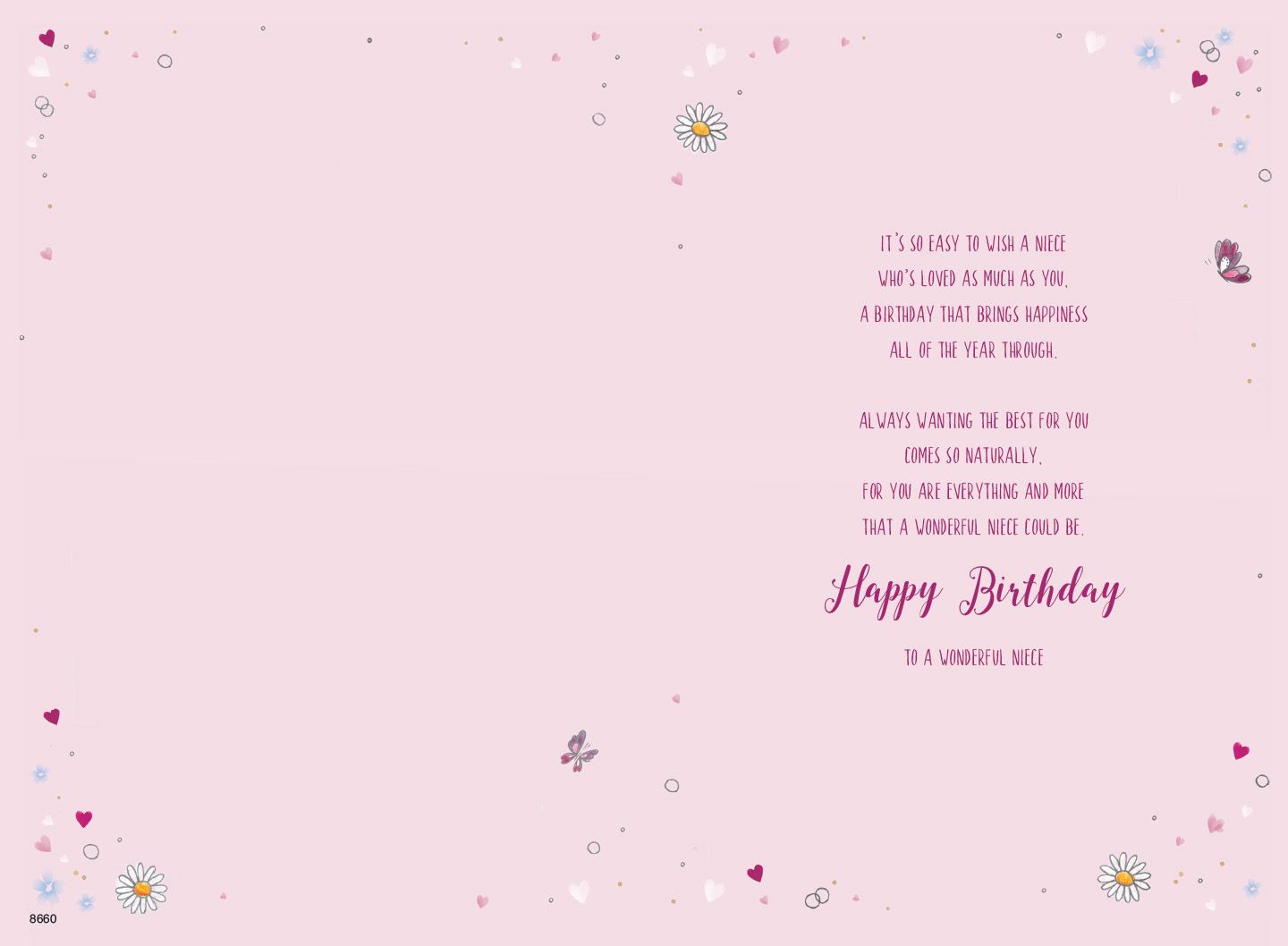 Verse reads: It's so easy to wish a Niece who's loved as much as you, a Birthday that brings happiness all of the year through. Always wanting the best for you comes so naturally. For you are everything and more that a wonderful Niece could be. Happy Birthay to a wonderful Niece