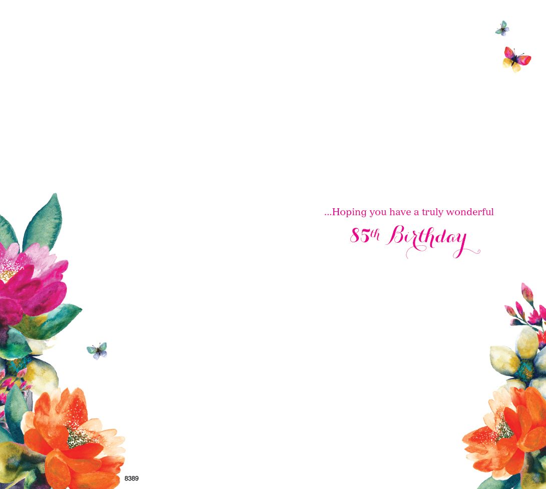 Verse reads: Front - Sending happy wishes on your special day....Inside - Hoping you have a truly wonderful 85th birthday