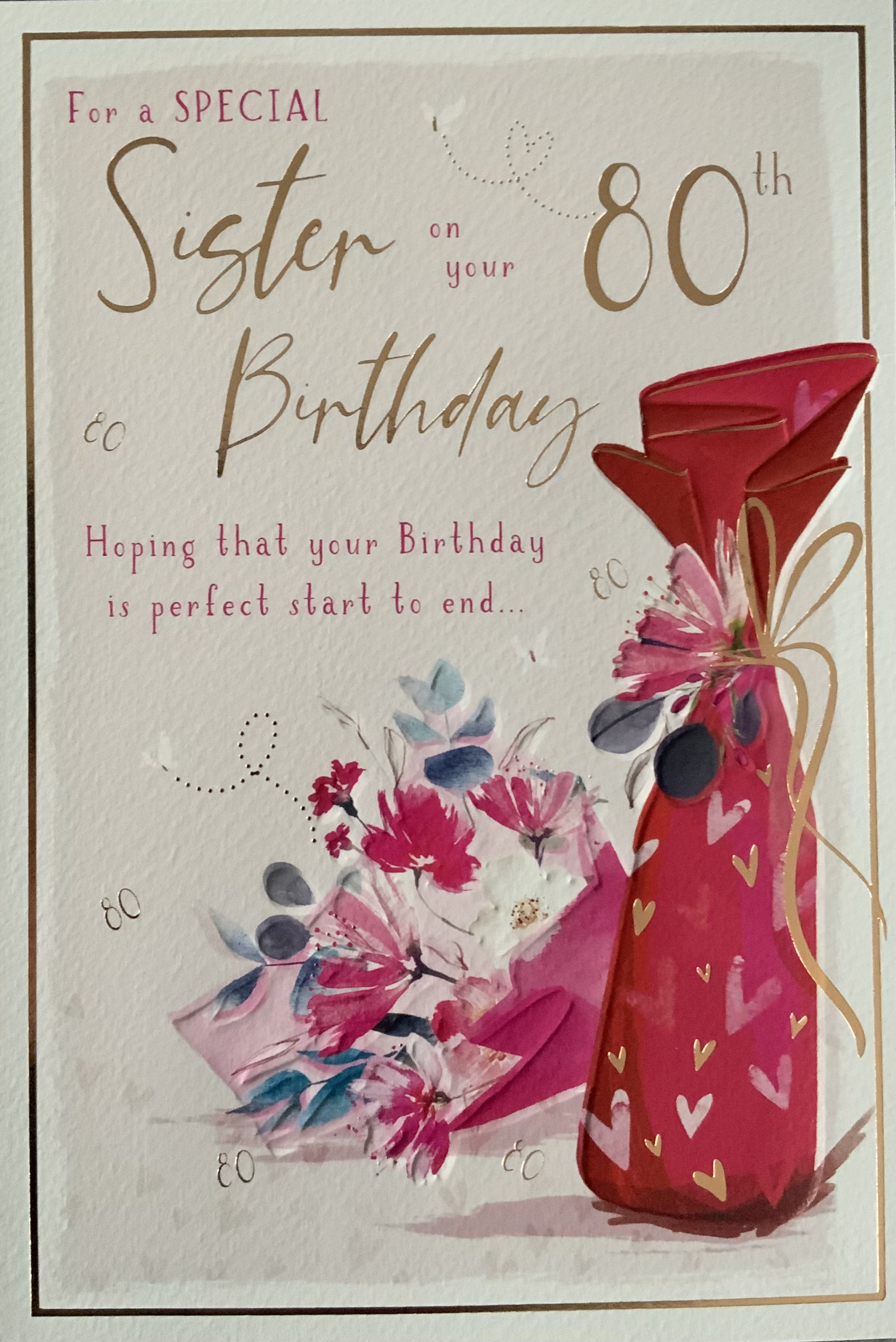 Sister 80th Birthday Card - Bottle wrapping. - Bouquet `of Flowers - Pink