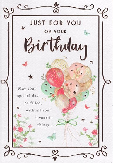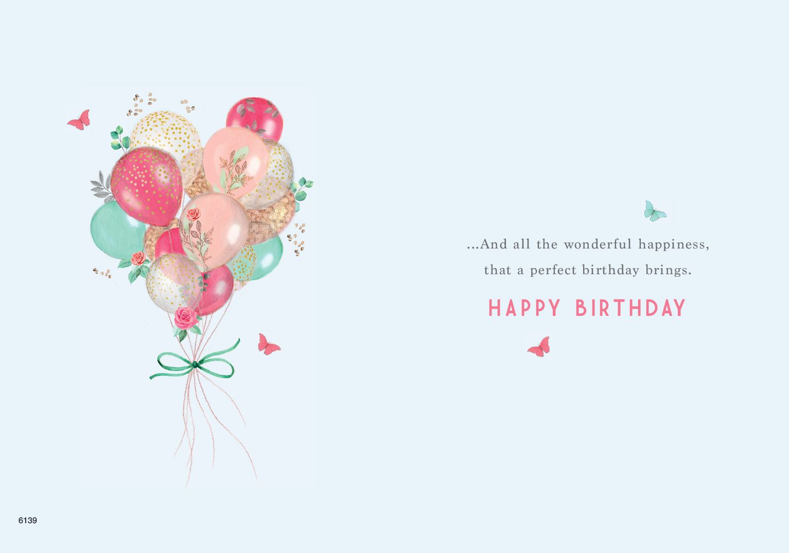 Verse reads: Front - May your special day be filled, with all your favourite things... Inside - ...And all the wonderful happiness, that a perfect Birthday brings. Happy Birthday