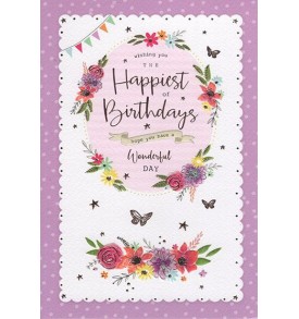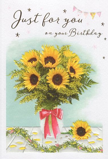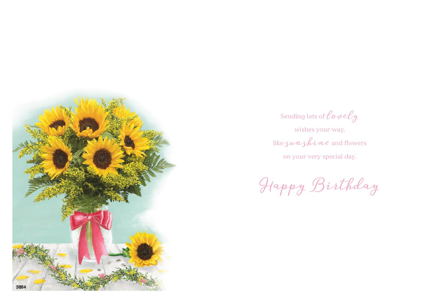 Verse reads: Sending lots of lovely wishes your way, like sunshine and flowers on your very special day. Happy Birthday