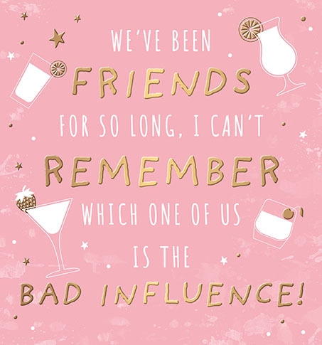 Verse reads: Front- We've been friends for so long, I can't remember which one of us is the Bad Influence! Inside- Happy Birthday