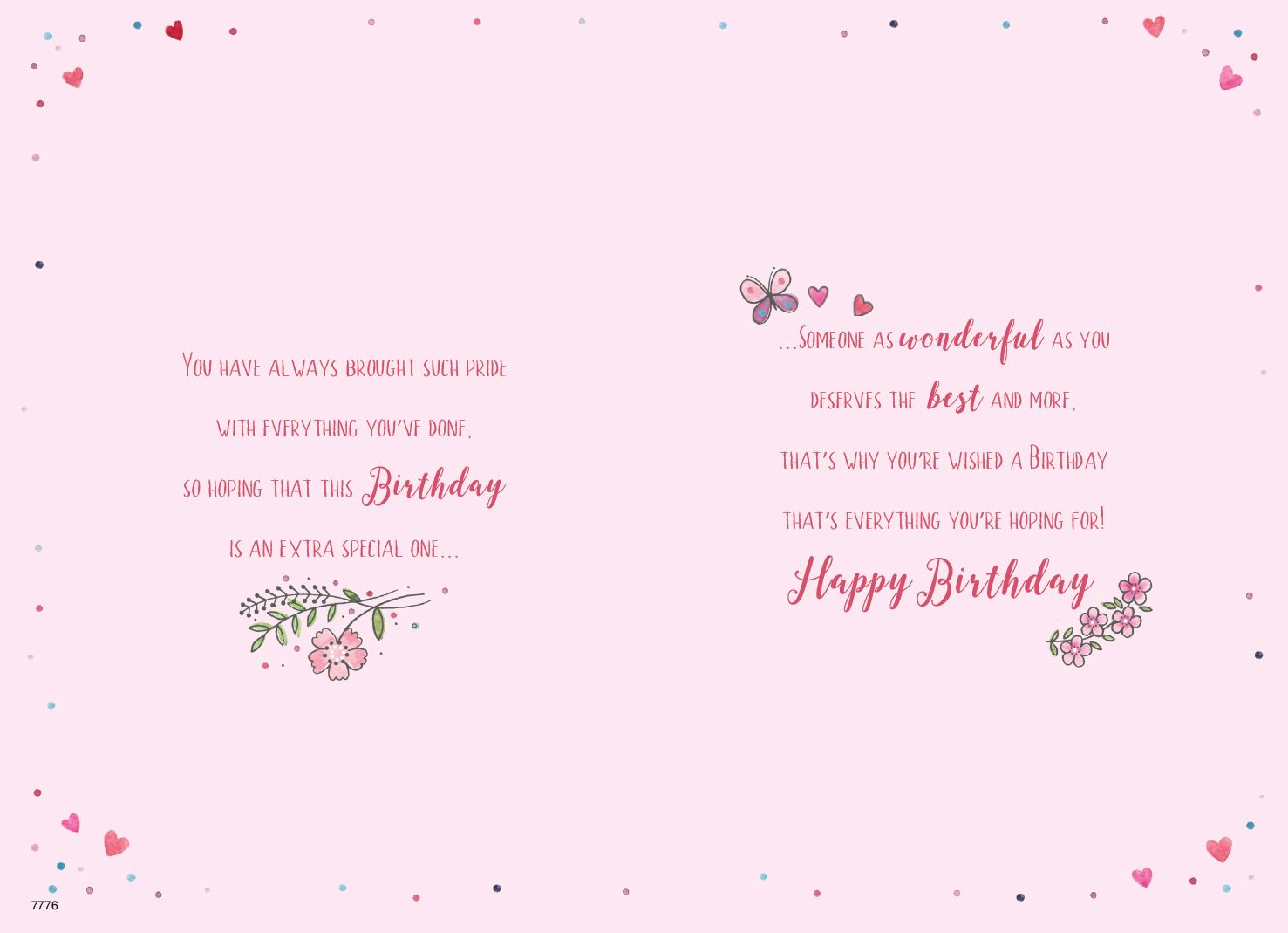 Verse reads: Front - Lots of love and wishes are being sent today, because you mean so very much in each and every way. Inside - You have always brought such pride with everything you've done, so hoping that this Birthday is an extra special one... ...Someone as wonderful as you deserves the best and more, that's why you're wished a Birthday that's everything you're hoping for! Happy Birthday