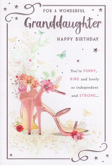 Verse reads: Front - You're funny, kind and lovely so independent and strong... Inside - ... When it comes to Granddaughters you can really do no wrong. ...You can brighten up the day with just one small smile, because being simply fabulous is just your natural style. Hoping that your birthday is as wonderful as you are, then you'll have the greatest day you've ever had by far! Happy Birthday