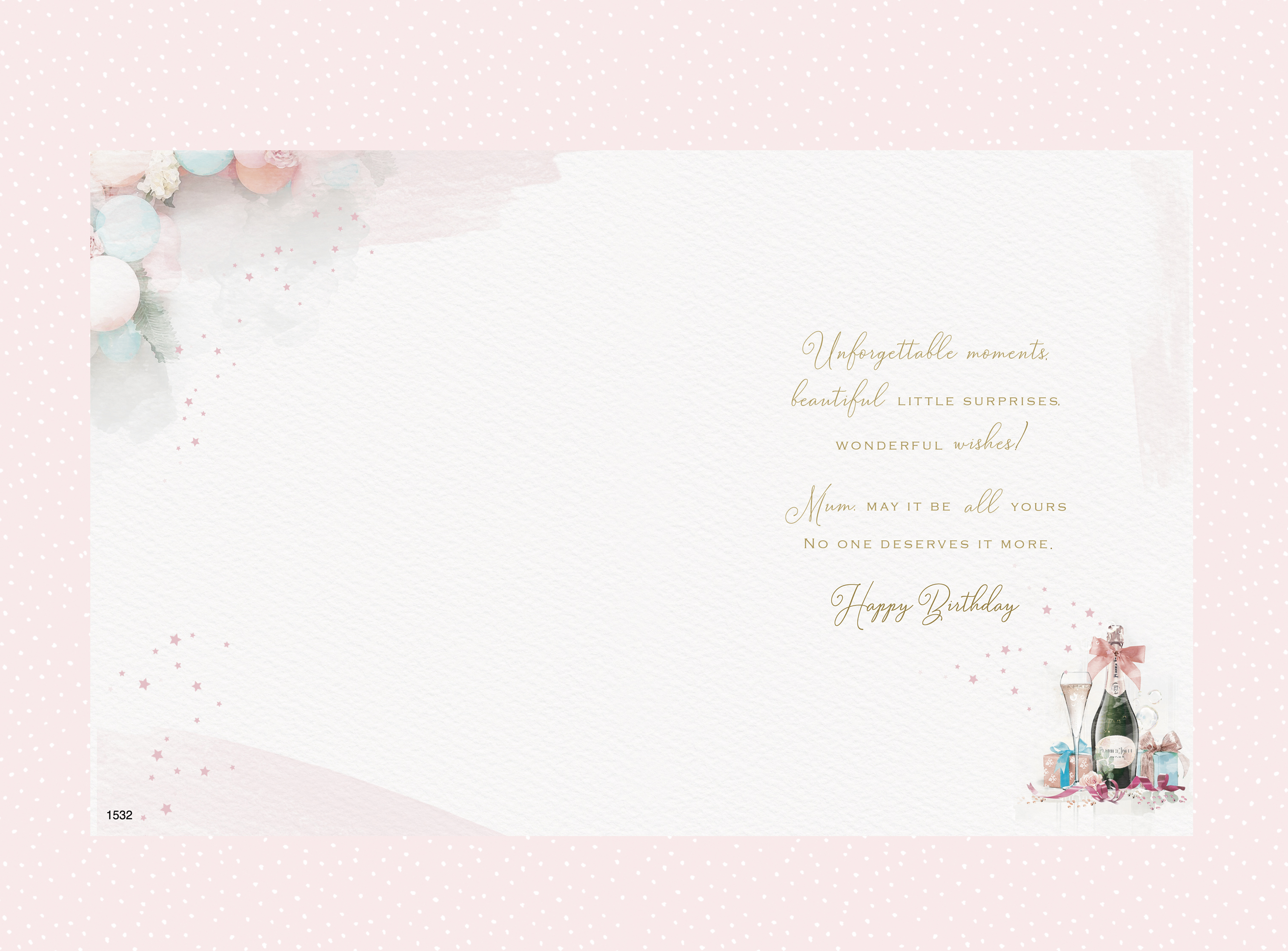 Verse reads: Unforgettable moments, beautiful little surprises, wonderful wishes! Mum may it be all yours No one deserves it more. Happy Birthday