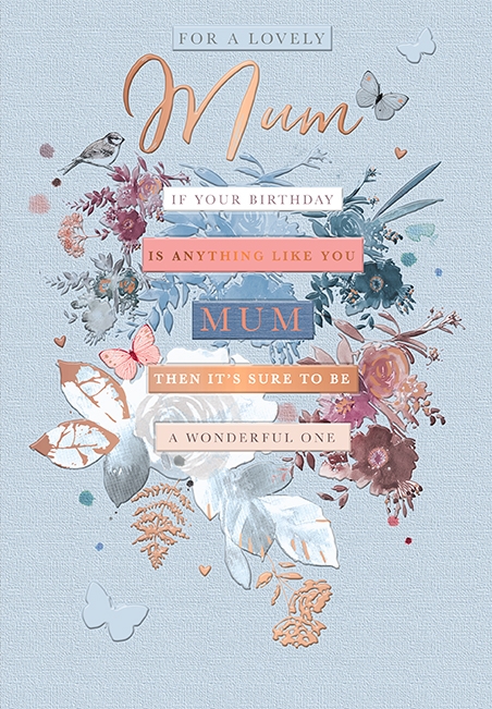 Verse reads: Front- For a lovely Mum if your Birthday is anything like you MUM then it's sure to be a wonderful one.. you pour your love into each kind and thoughtful thing you do, you're there with words designed to care - Nothing's too much for you... You always think of others first because that's just your way, so hope each moment holds a special smile for you today. Happy Birthday to a wonderful MUM