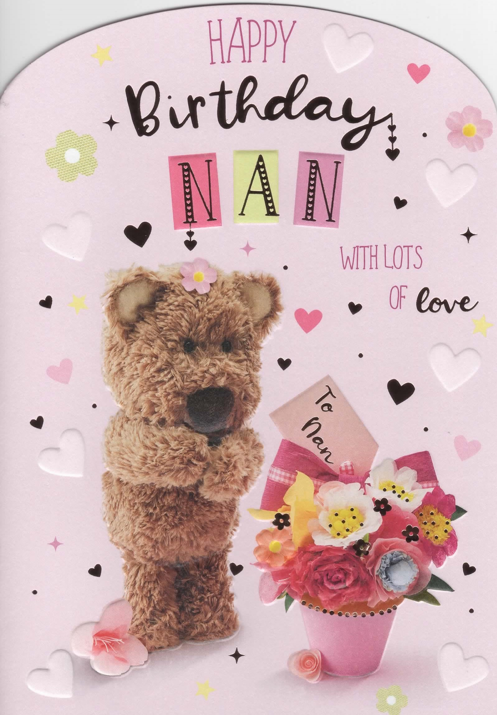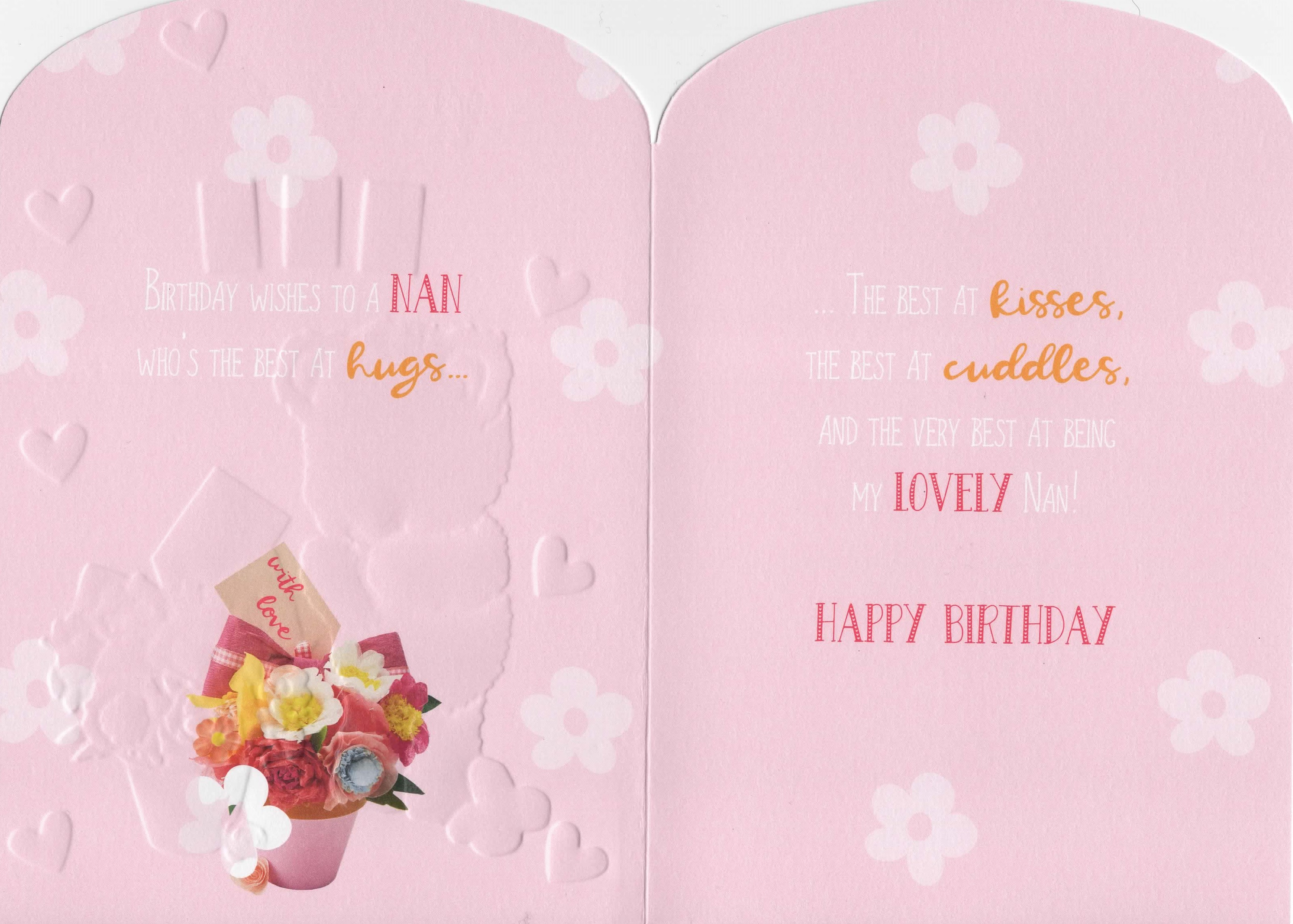 Verse reads: Birthday wishes to a Nan who's the best at hugs... ...The best at kisses, the best at cuddles, and the very best at being my lovely Nan! Happy Birthday