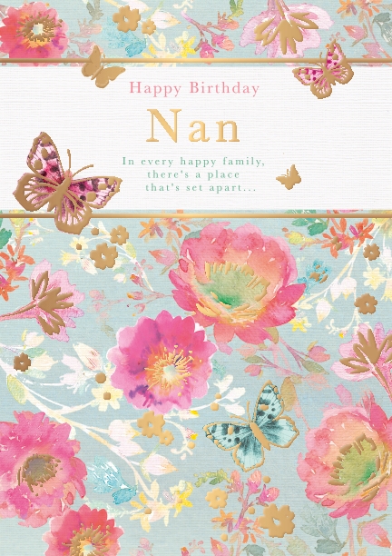 Verse reads: Front - In every happy family, there's a place that's set apart... Inside - ... For a very special Nan with a wise and loving heart. And your birthday is the perfect time to send a wish and say, There is no Nan anywhere loved more than you today. Birthday wishes, with love Nan