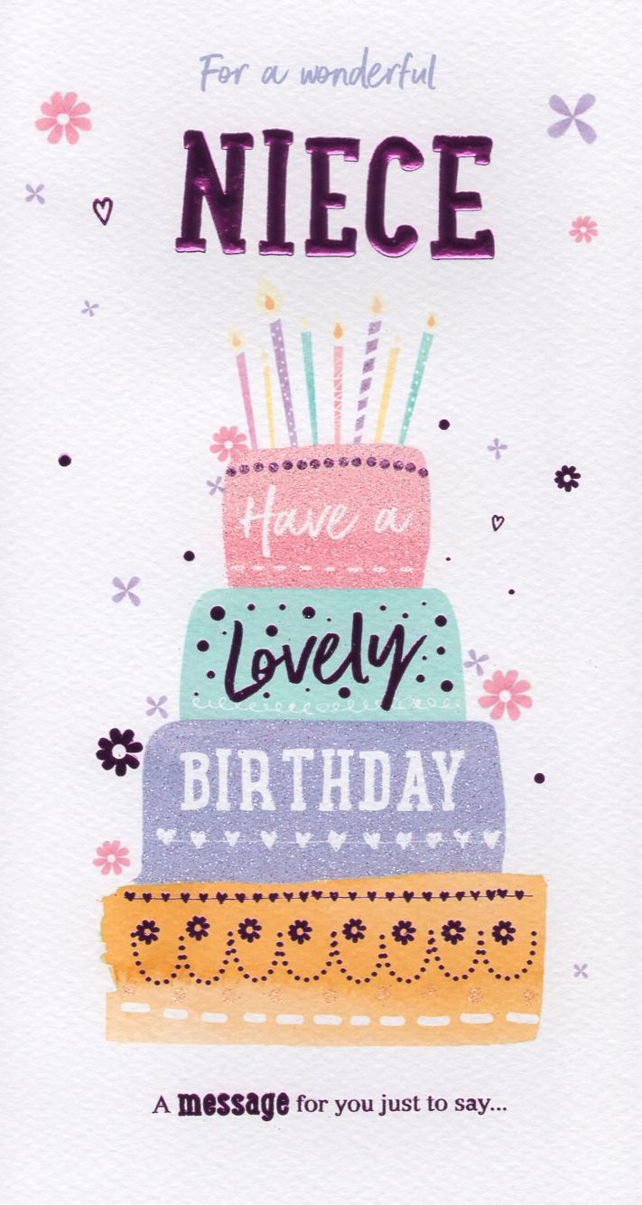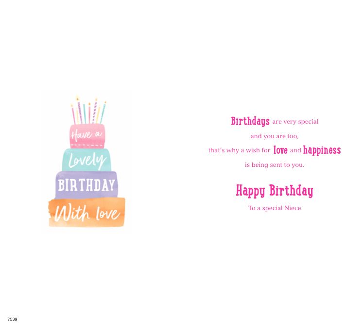 Verse reads: Front- A message for you just to say... Inside- Birthdays are very special and you are too, that's why a wish for love and happiness is being sent to you. Happy Birthday To a special Niece